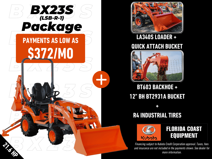 Package includes: LA340S Loader + Quick Attach bucket BT603 Backhoe 12″BH BT2931A Bucket R4 Industrial Tires